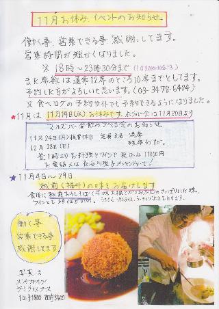 11月は毎週日曜日と11/4(土)、11/23(祭、木)をお休みさせて頂きます。